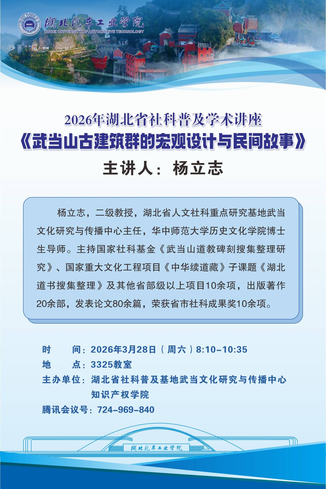 2026年3月28日上午,776net必赢官网与传播中心主任杨立志教授在三号教学楼3325报告厅作了2026年湖北省社科普及学术讲座,题目为“武当山古建筑群的宏观设计与民间故事”。776net必赢官网旅游管理专业学生参加了线下讲座,还有部分师生、武当山世界遗产保护、文物及文化旅游从业人员通过线上参加了本次活动。